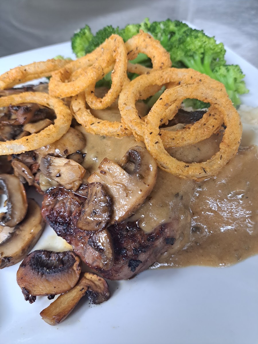 Located within the River Walk building. We sat in the dining area by the windows. Beautiful view of the river. Enjoyed fish and chips and Madagascar steak. Waitress was attentative and friendly. After dinner, we checked out the shops and walked along the river. A lot of parking spaces. Repeat customer with friends.